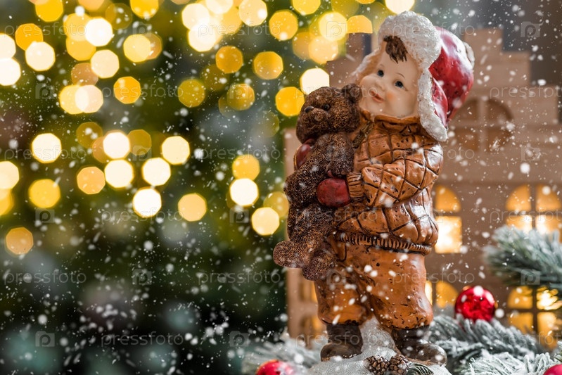 Рождественская открытка в стиле ретро с милой фигуркой ребенка на красивом заснеженном фоне. Мальчик в шапке-ушанке обнимает медвежонка. Концепция зимнего праздника Нового 2024 года