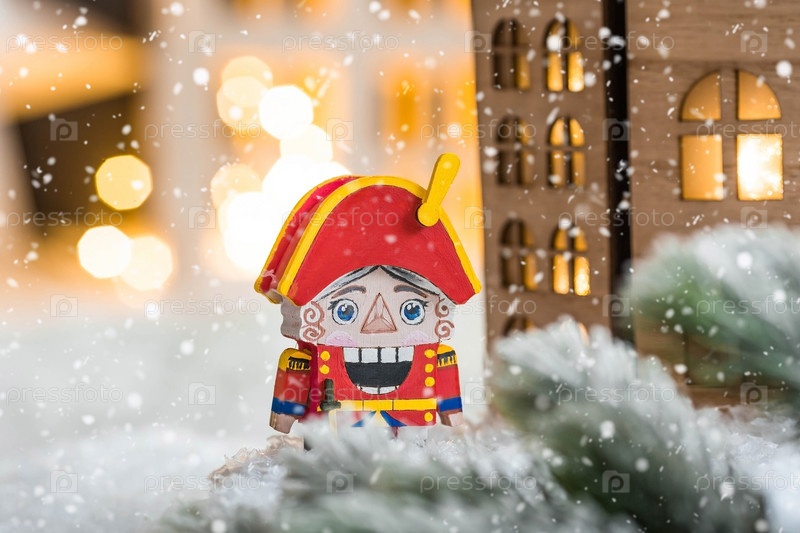 Игрушечный солдатик Щелкунчик и грецкие орехи на рождественском фоне с гирляндой. Балет Чайковского. Рождественская новогодняя открытка 2024