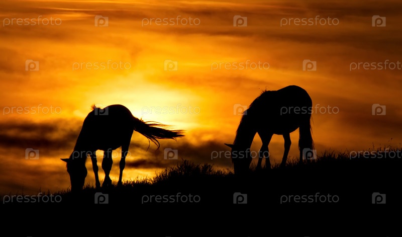 Восточный Казахстан, Лошади в лучах закатного солнца в природном горном парке Баянаул