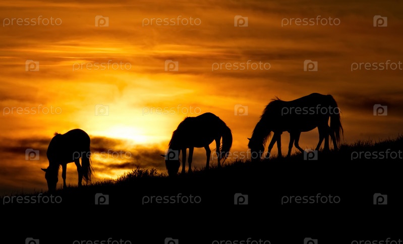 Восточный Казахстан, Лошади в лучах закатного солнца в природном горном парке Баянаул
