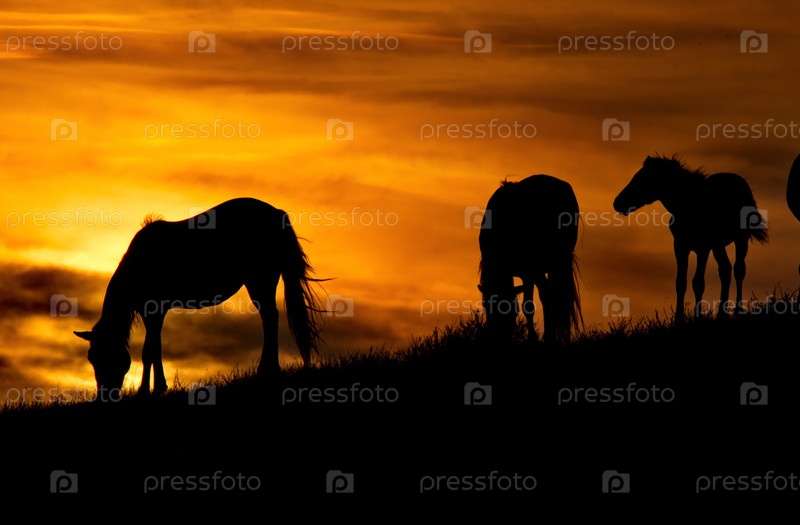 Восточный Казахстан, Лошади в лучах закатного солнца в природном горном парке Баянаул