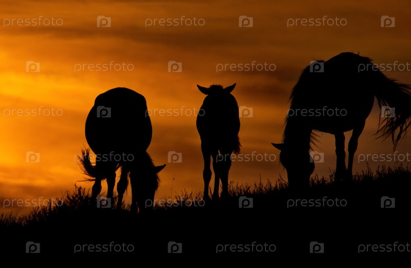 Восточный Казахстан, Лошади в лучах закатного солнца в природном горном парке Баянаул