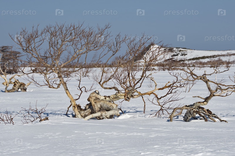 Россия. Дальний Восток, остров Итуруп. Причудливая корявость каменной березы, которая обитает только на Камчатке и Курильских островах, образуется из-за постоянных ветров с Тихого океана