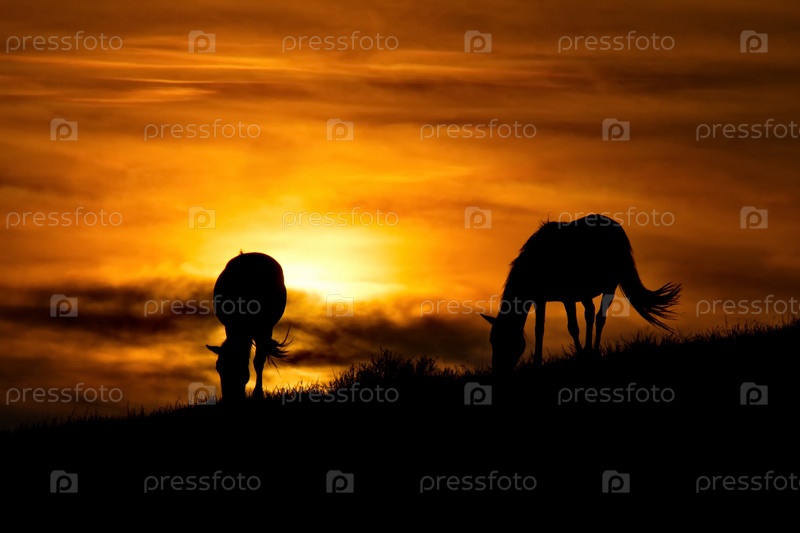 Восточный Казахстан, Лошади в лучах закатного солнца в природном горном парке Баянаул