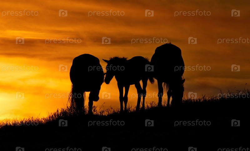 Восточный Казахстан, Лошади в лучах закатного солнца в природном горном парке Баянаул