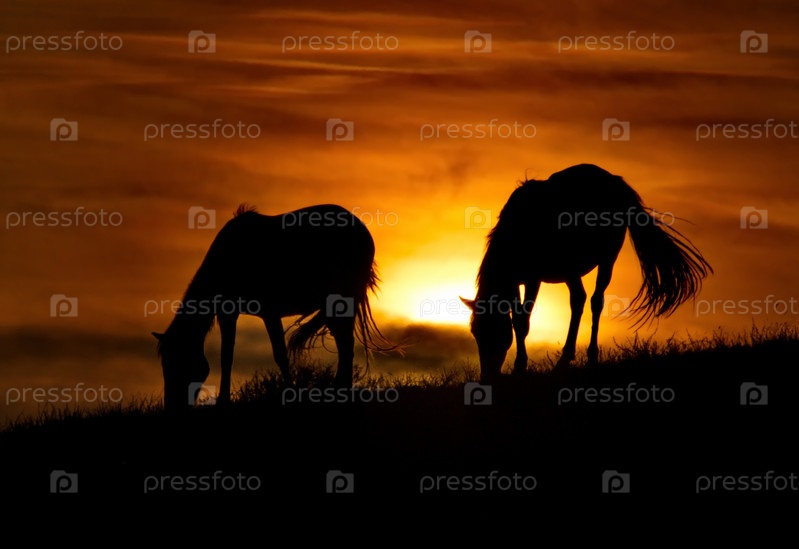 Восточный Казахстан, Лошади в лучах закатного солнца в природном горном парке Баянаул