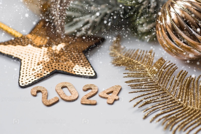 Баннер. С Новым годом и Рождеством. Золотые цифры 2024, снег, еловые ветки и елочные игрушки на белом фоне. Флаер. Приглашение