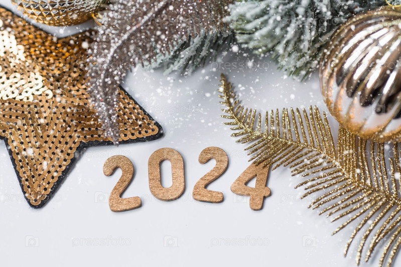 Баннер. С Новым годом и Рождеством. Золотые цифры 2024, снег, еловые ветки и елочные игрушки на белом фоне. Флаер. Приглашение