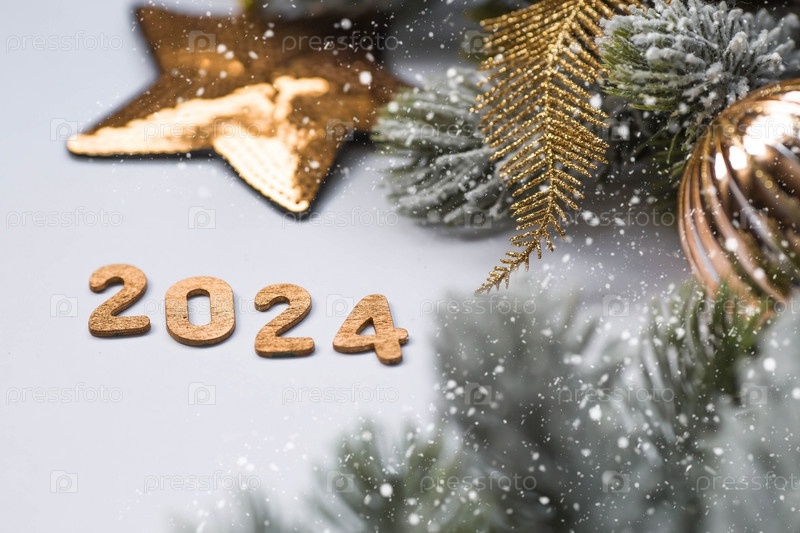 Баннер. С Новым годом и Рождеством. Золотые цифры 2024, снег, еловые ветки и елочные игрушки на белом фоне. Флаер. Приглашение
