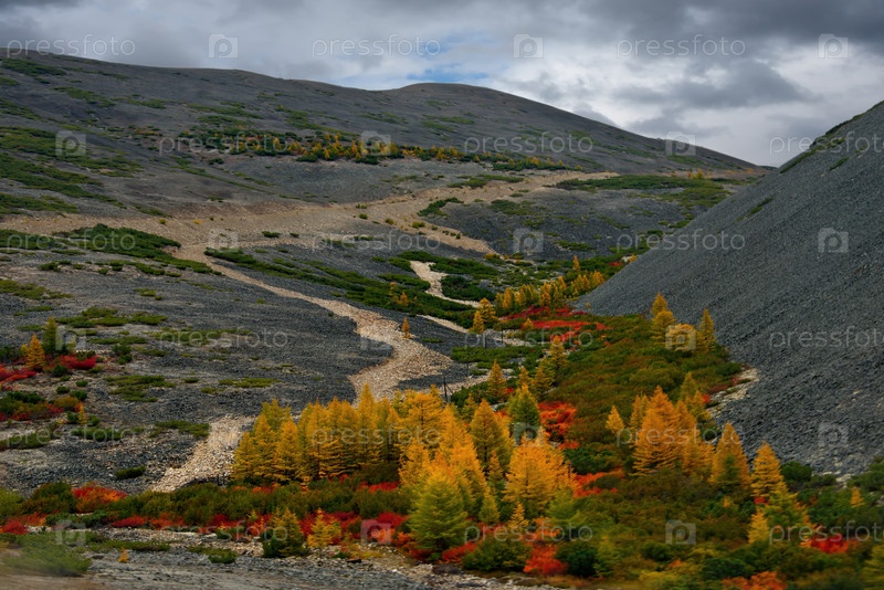 Россия. Магаданская область. Ранняя осень на живописных горных перевалах, поросших мхом, желтыми лиственницами, кустами красной черники и карликовой березой вокруг долины реки Колымы