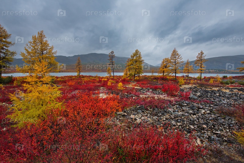 Россия. Магаданская область. Ранняя осень на живописных горных перевалах, поросших мхом, желтыми лиственницами, кустами красной черники и карликовой березой вокруг долины реки Колымы