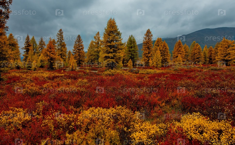 Россия. Магаданская область. Ранняя осень на живописных горных перевалах, поросших мхом, желтыми лиственницами, кустами красной черники и карликовой березой вокруг долины реки Колымы