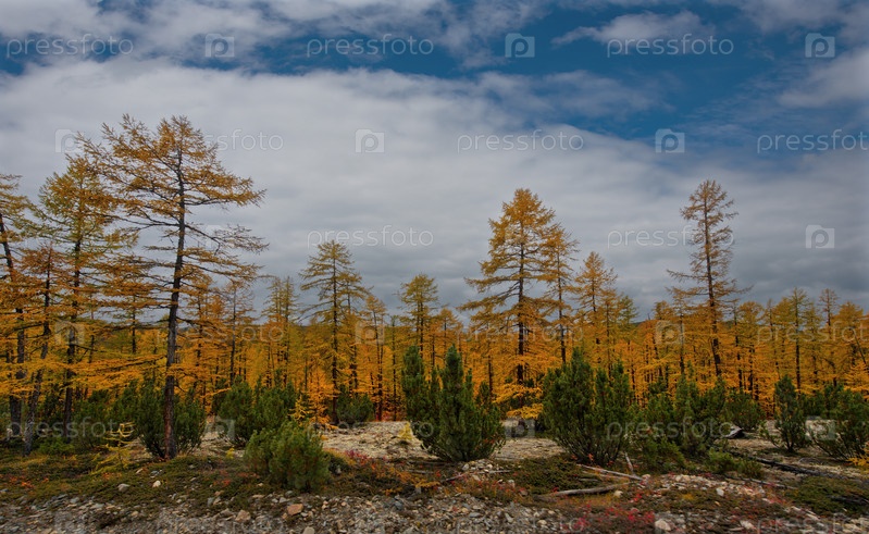 Россия. Магаданская область. Ранняя осень на живописных горных перевалах, поросших мхом, желтыми лиственницами, кустами красной черники и карликовой березой вокруг долины реки Колымы
