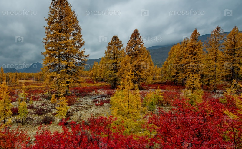 Россия. Магаданская область. Ранняя осень на живописных горных перевалах, поросших мхом, желтыми лиственницами, кустами красной черники и карликовой березой вокруг долины реки Колымы