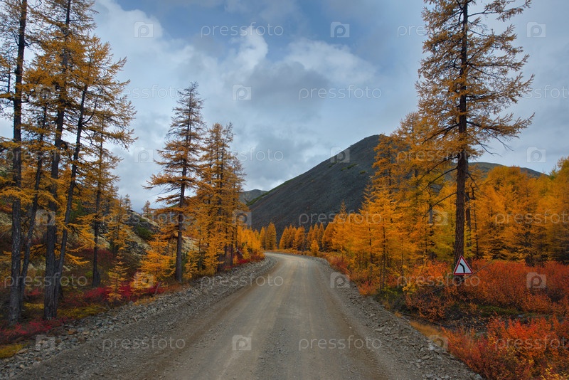 Россия. Магаданская область. Ранняя осень на живописных горных перевалах, поросших мхом, желтыми лиственницами, кустами красной черники и карликовой березой вокруг долины реки Колымы