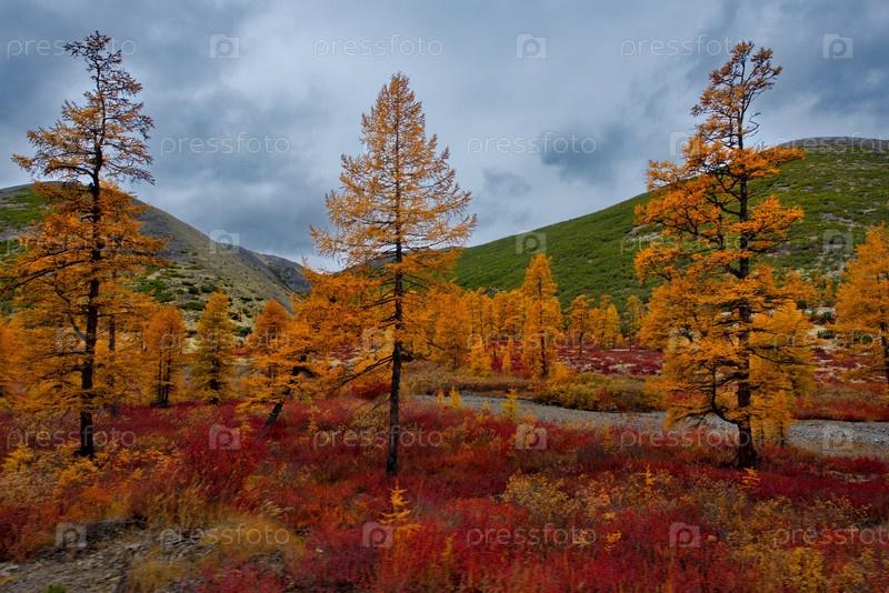 Россия. Магаданская область. Ранняя осень на живописных горных перевалах, поросших мхом, желтыми лиственницами, кустами красной черники и карликовой березой вокруг долины реки Колымы