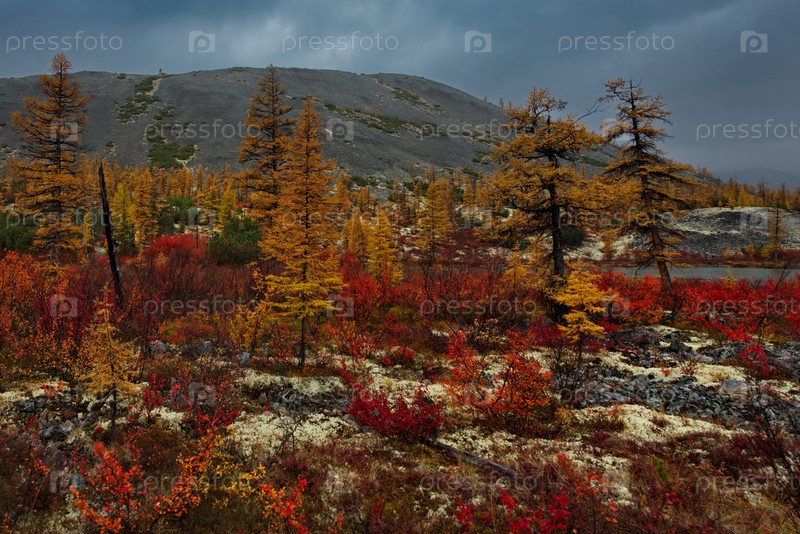 Россия. Магаданская область. Ранняя осень на живописных горных перевалах, поросших мхом, желтыми лиственницами, кустами красной черники и карликовой березой вокруг долины реки Колымы