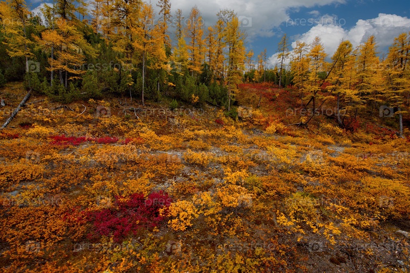 Россия. Магаданская область. Ранняя осень на живописных горных перевалах, поросших мхом, желтыми лиственницами, кустами красной черники и карликовой березой вокруг долины реки Колымы