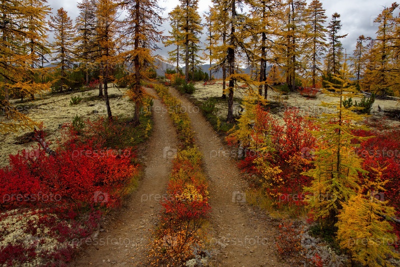 Россия. Магаданская область. Ранняя осень на живописных горных перевалах, поросших мхом, желтыми лиственницами, кустами красной черники и карликовой березой вокруг долины реки Колымы