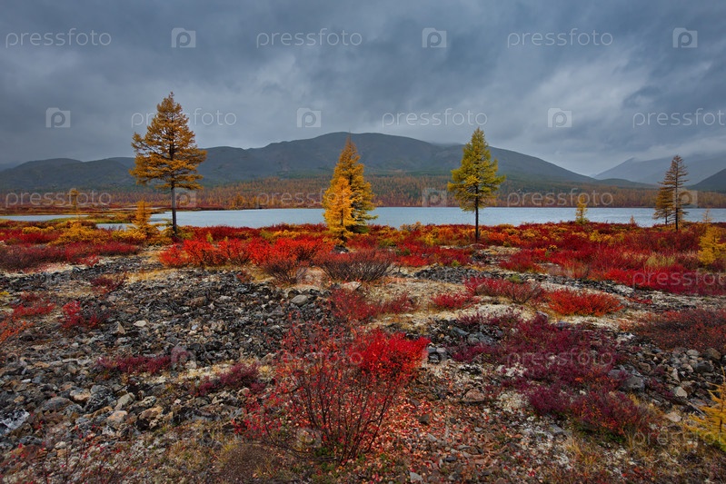 Россия. Магаданская область. Ранняя осень на живописных горных перевалах, поросших мхом, желтыми лиственницами, кустами красной черники и карликовой березой вокруг долины реки Колымы