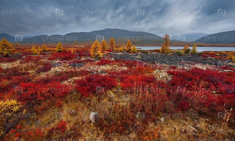 Россия. Магаданская область. Ранняя осень на живописных горных перевалах, поросших мхом, желтыми лиственницами, кустами красной черники и карликовой березой вокруг долины реки Колымы