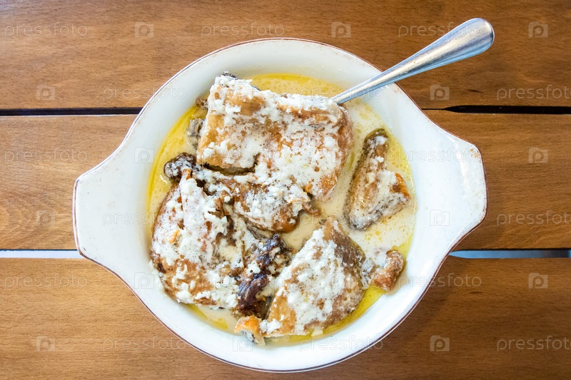 Вид сверху на порцию Чкмерула в миске на столе