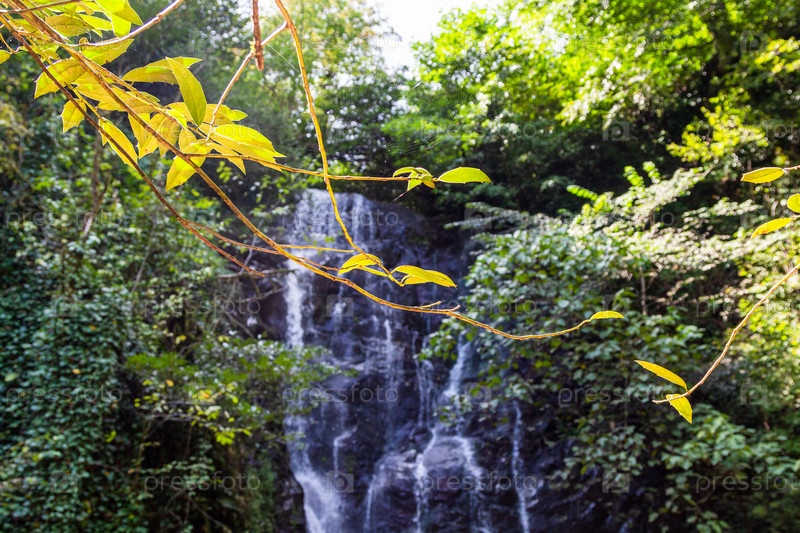 Ветка с листьями, освещенная солнцем и водопадом
