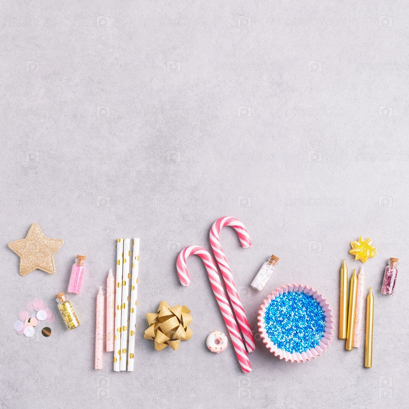 Конфетти, праздничные свечи и сладости на сером фоне, место для текста