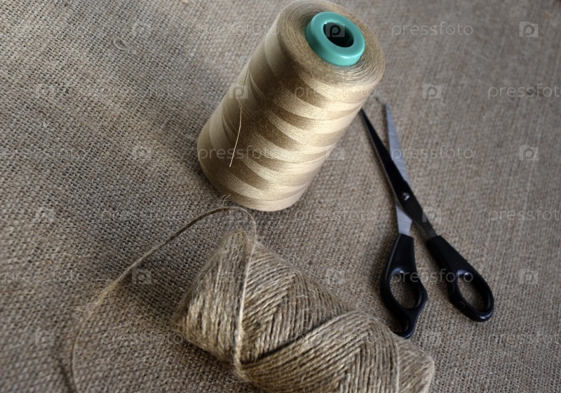 Желтые мотки ниток и ножницы на фоне мешковины. Желтые грубые тканевые нитки и ножницы