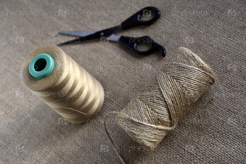 Желтые мотки ниток и ножницы на фоне мешковины. Желтые грубые тканевые нитки и ножницы