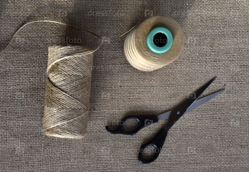 Желтые мотки ниток и ножницы на фоне мешковины. Желтые грубые тканевые нитки и ножницы