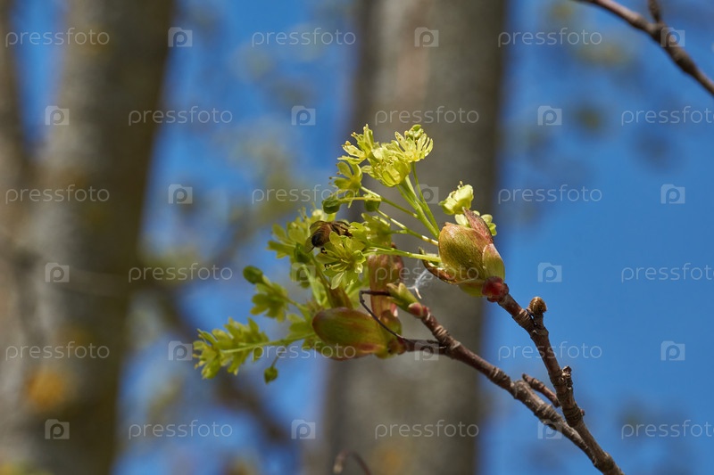 Растворяются цветочные почки остролистного клёна (лат. Acer platanoides). Деревянный вид растения рода Асер семейства Сапиндовых