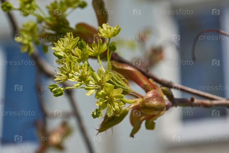 Растворяются цветочные почки остролистного клёна (лат. Acer platanoides). Деревянный вид растения рода Асер семейства Сапиндовых