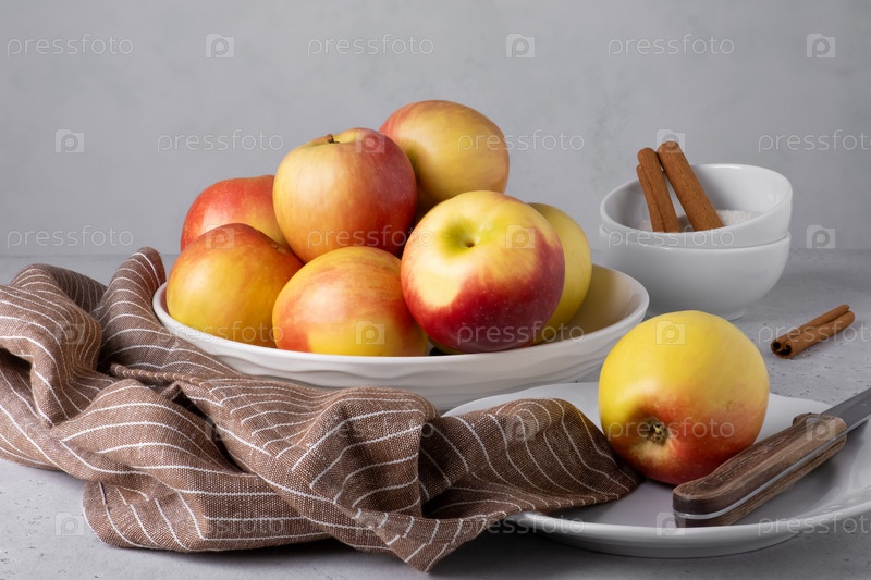 Красивые спелые яблоки на тарелке с ножом и салфеткой. Селективный фокус