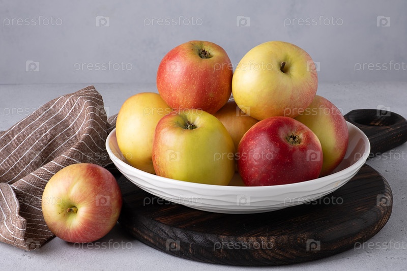 Красивые спелые яблоки на тарелке. Селективный фокус