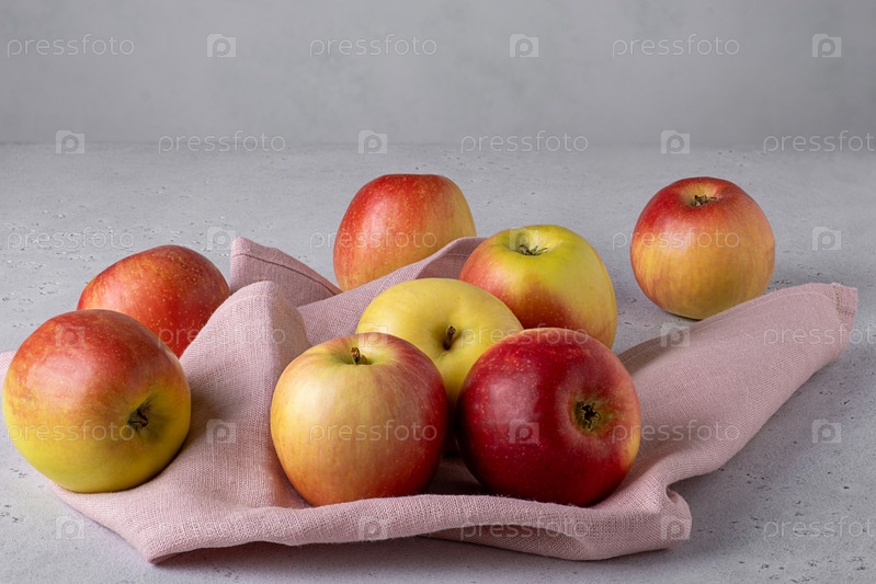 Красивые спелые яблоки в соли на льняной салфетке. Селективный фокус