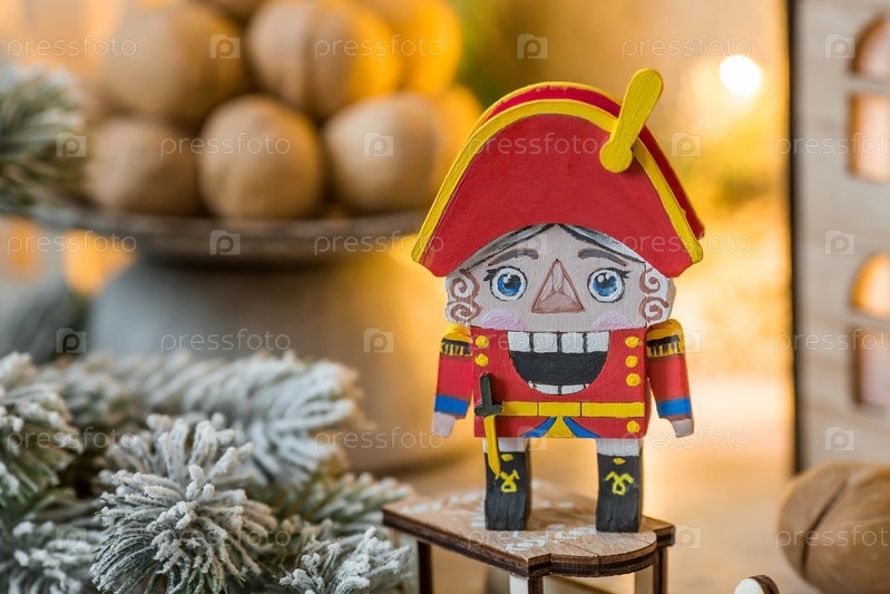 Игрушечный солдатик Щелкунчик и грецкие орехи на рождественском фоне с гирляндой. Балет Чайковского. Рождественская новогодняя открытка 2024