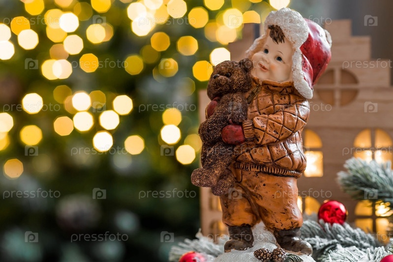 Рождественская открытка в стиле ретро с милой фигуркой ребенка на красивом заснеженном фоне. Мальчик в шапке-ушанке обнимает медвежонка. Концепция зимнего праздника Нового 2024 года