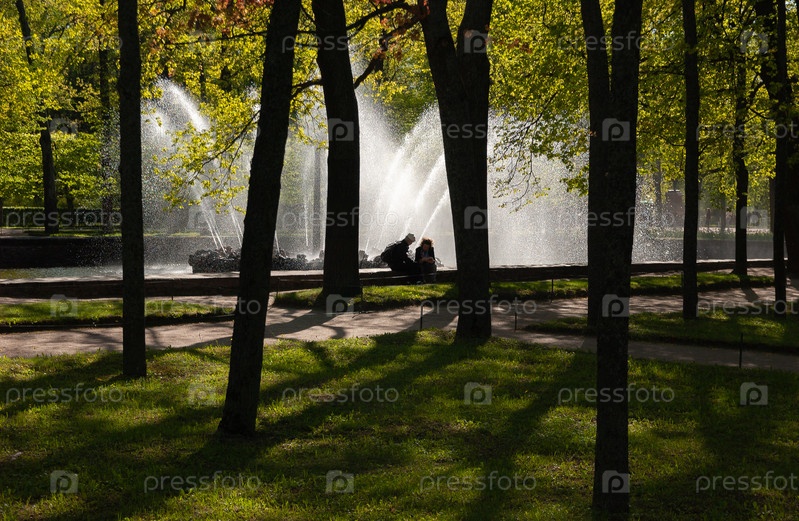 Тенистый парк, солнечные струи фонтана, мужчина и женщина на лавочке. Санкт-Петербург, Петергоф