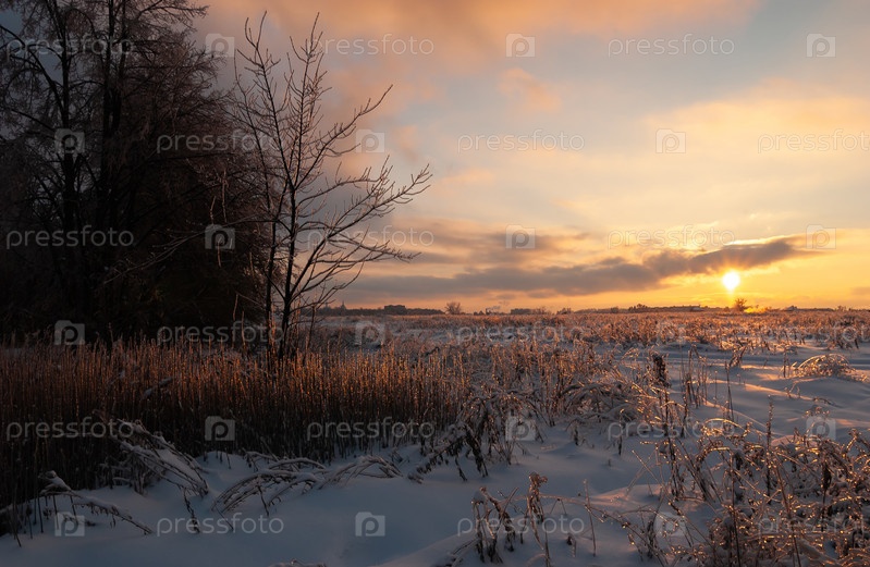 Поле, закат, трава и кусты покрыты разноцветным искрящимся льдом. Московская область, Россия