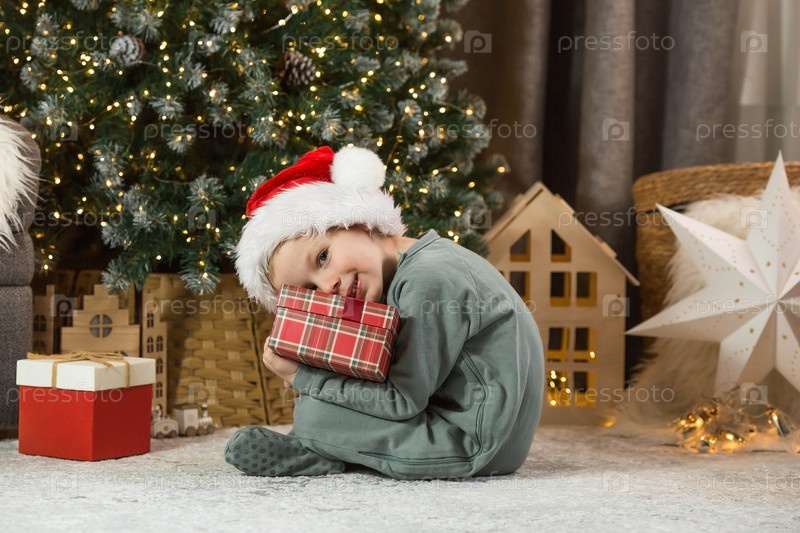 Красивый маленький мальчик сидит под елкой и держит в руках красную коробку. Новогодний подарок. Концепция празднования Рождества и Нового 2024 года