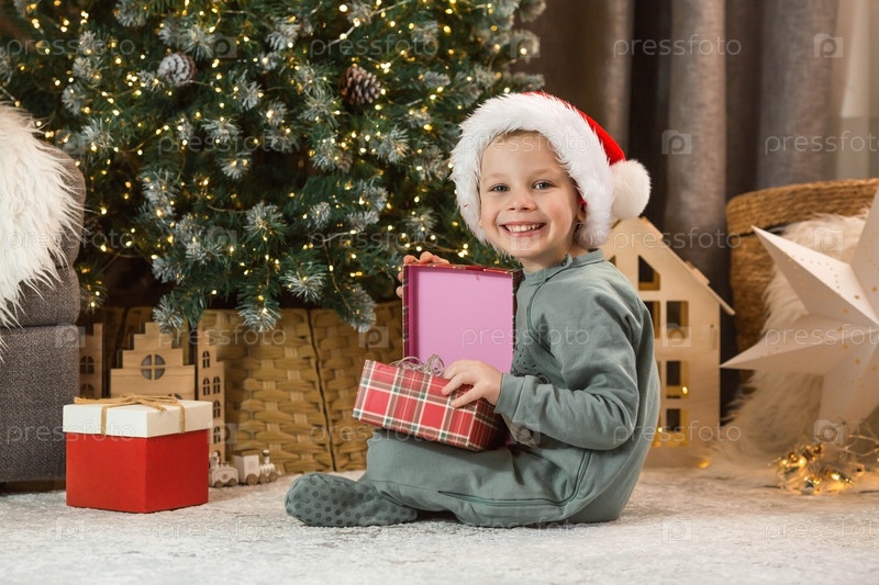 Красивый маленький мальчик сидит под елкой и держит в руках красную коробку. Новогодний подарок. Концепция празднования Рождества и Нового 2024 года