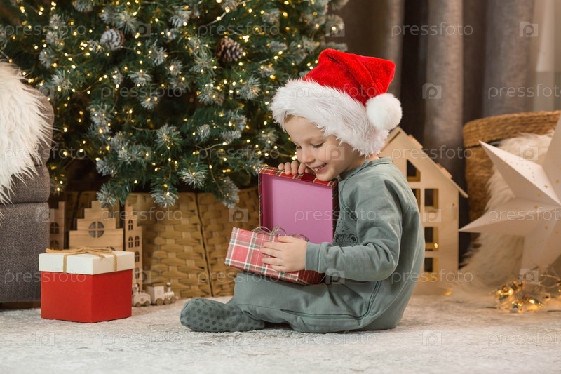 Красивый маленький мальчик сидит под елкой и держит в руках красную коробку. Новогодний подарок. Концепция празднования Рождества и Нового 2024 года