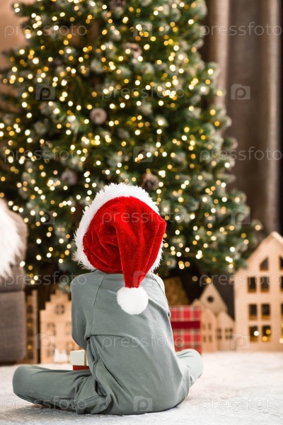 Красивый маленький мальчик 4 лет в шапке Санта-Клауса украшает елку в гостиной. Сочельник. Концепция празднования Рождества и Нового 2024 года