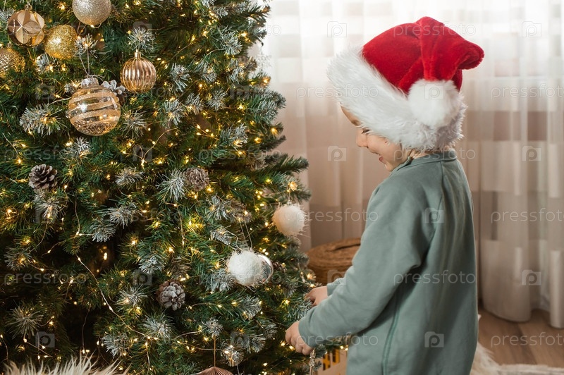 Красивый маленький мальчик 4 лет в шапке Санта-Клауса украшает елку в гостиной. Сочельник. Концепция празднования Рождества и Нового 2024 года