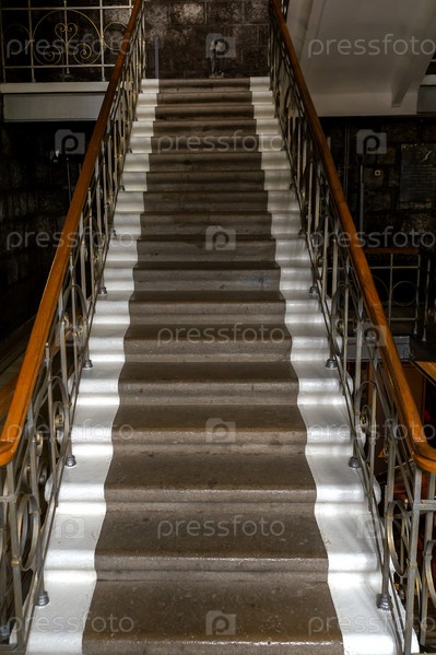 Большая бетонная лестница, вдоль которой установлены металлические перила с деревянными поручнями