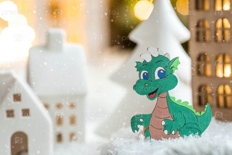 Знак зодиака. Новогодняя игрушка в виде зеленого деревянного дракона на фоне гирлянды и красивого боке. Светящийся фон рождественских праздников. Китайский гороскоп на 2024 год