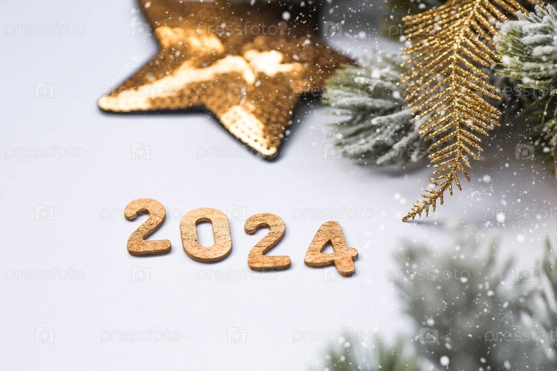 Баннер. С Новым годом и Рождеством. Золотые цифры 2024, снег, еловые ветки и елочные игрушки на белом фоне. Флаер. Приглашение