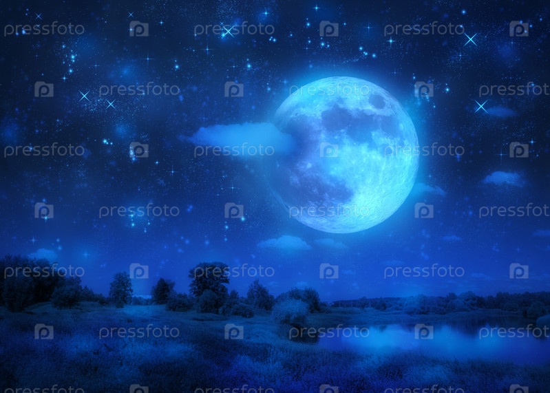 Голубое полнолуние над ночной рекой