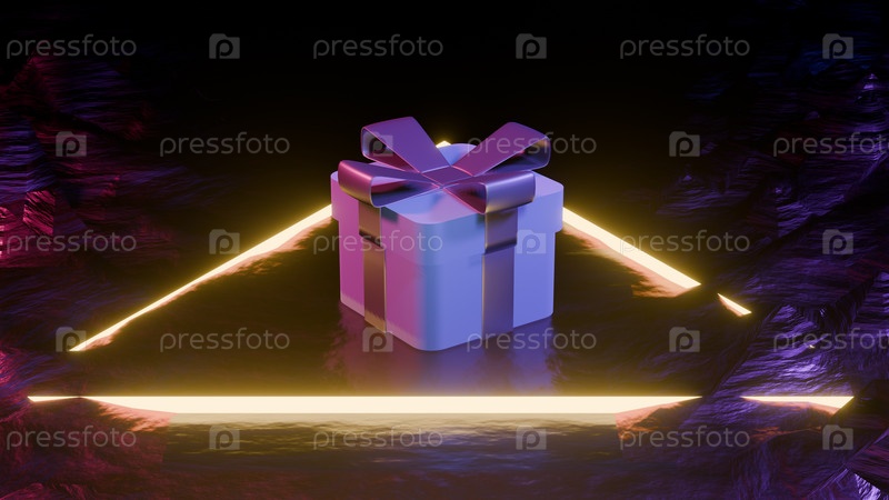 Открытка с подарочной коробкой, неоновое освещение, 3D-рендеринг